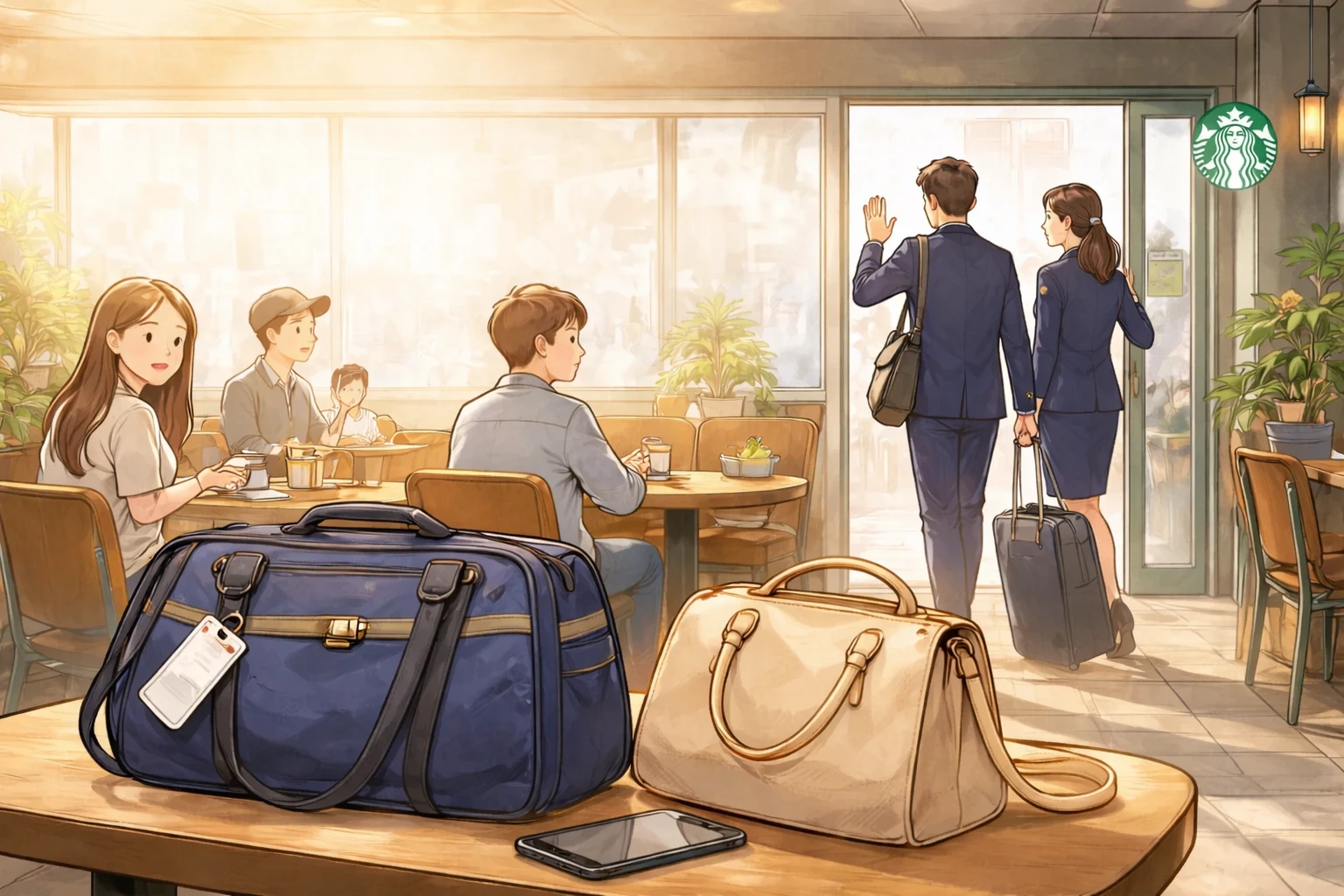 서울의 한 스타벅스에 승무원들이 왔다. 그들은 가방을 자리에 놓았다. 그래서 다른 손님이 앉을 자리가 거의 없었다.